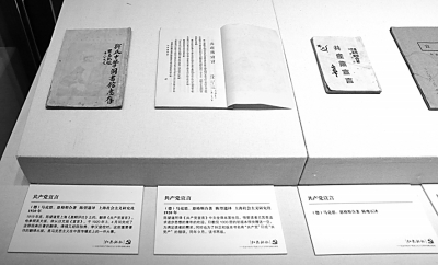 国图“红色记忆——纪念中国共产党成立九十五周年馆藏文献展”中展出的《共产党宣言》中文译本。新华社记者 殷刚摄