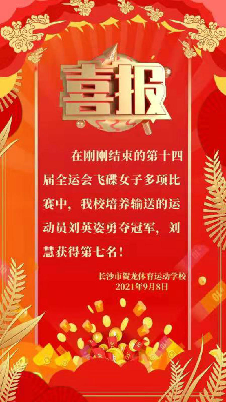 在2021年9月8日下午结束的中华人民共和国第十四届运动会射击项目女子飞碟多向决赛中,我校培养输送的运动员刘英姿,以43中的成绩勇夺个人金牌,刘慧获得第七名。