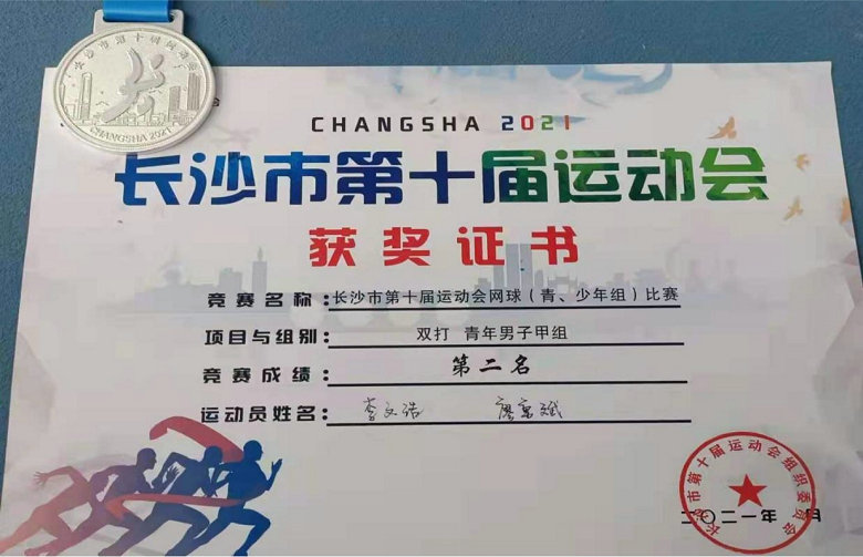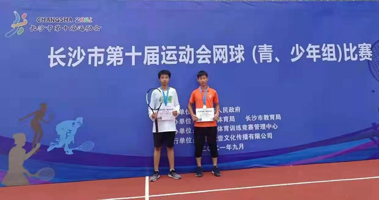 2021年9月19~9月20日,长沙市第十届运动会网球(青年组)比赛在博才卓越小学进行,我校网球队廖勇斌、李文浩2名队员在聂特老师的指导下,不惧强手,顽强拼搏,勇夺青年甲组双打银牌。