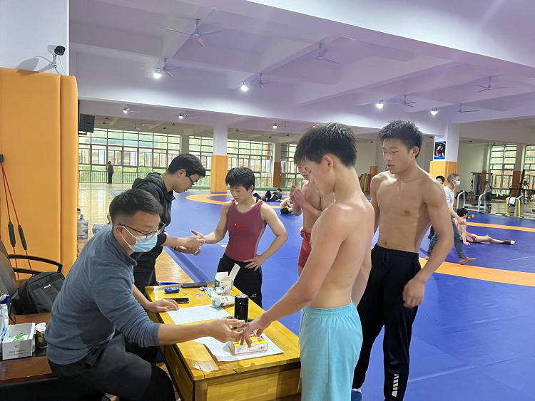 4月14日,体育科研人员于摔跤队开展跟队监测工作