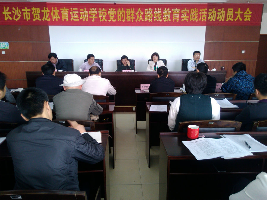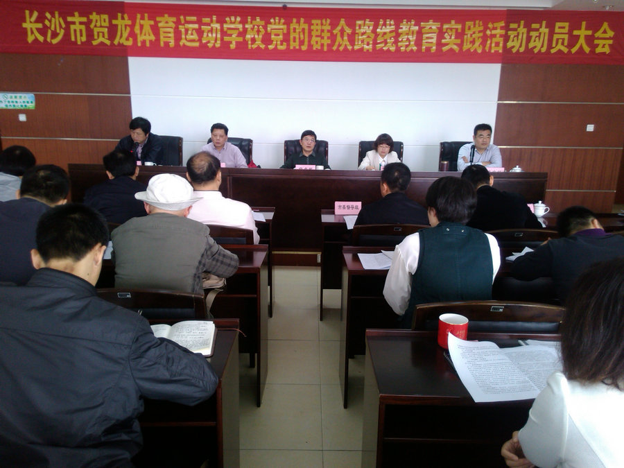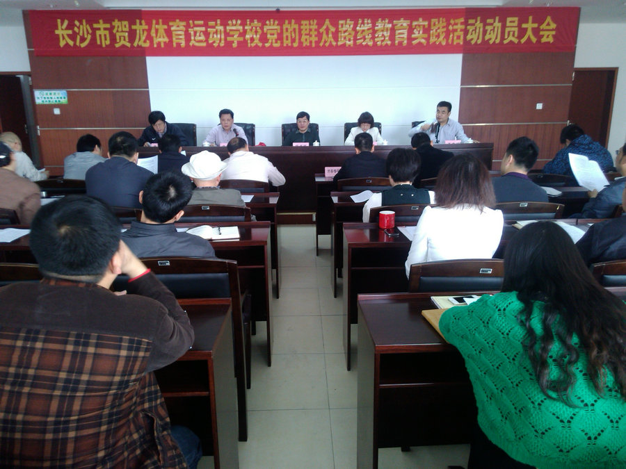 2014年4月3日上午9:00,长沙市贺龙体育运动学校党的群众路线教育实践活动动员会在学校四楼会议室召开。会议由校长李文格主持,党委书记章定发作动员报告。市委督导组第十组副组长姚喜林、长沙市体育局党组书记、局长李卓民、副局长李德安出席动员大会并发表讲话。全校党员及部分教职工代表参加会议,并参与了民主评议。