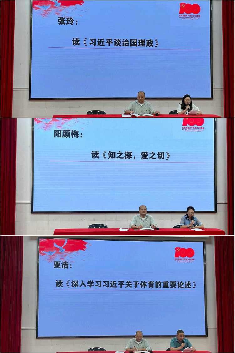 活动伊始,全体党员在阳颜梅同志的带领下,举起右手重温入党誓词。接着,支部三名党员代表张玲、阳颜梅、粟浩结合具体阅读书目做心得分享。