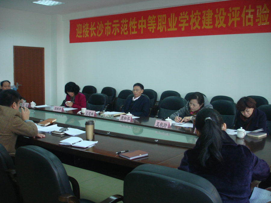 2013年12月3日,市中职示范性学校评估验收组一行4人莅临我校进行为期半天的市级中职示范性学校创建评估验收。评估组首先听取了李文格校长题为《中职示范性学校创建重点项目评估验收自评报告》的工作汇报,随后,评估组通过实地察看校容校貌及办学设施、现场听课、师生个别访谈、查阅支撑材料等形式,全面了解了3年来学校示范性学校创建的过程及取得的成绩。对照《长沙市示范性中等职业学校建设评估验收标准》中五个一级指标、十二个二级指标逐条评估评分。