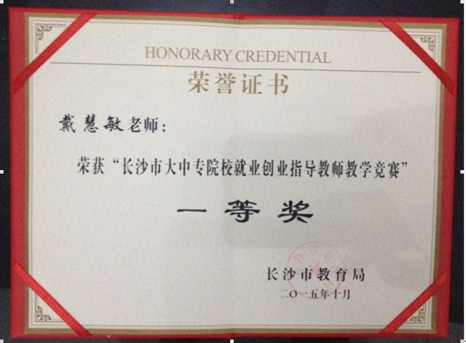 10月14日上午 , 由长沙市教育局主办的大中专院校就业指导教师教学竞赛于在长沙高新技术职业学校举行,来自长沙市及各区县中、高职院校的18名教师同台竞技,我校戴慧敏老师以《职业理想开启美好生活》一课在12名中职组选手中脱颖而出,获得了第一名的优异成绩,荣获一等奖。