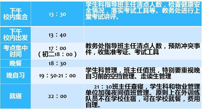 教务处乔栋主任重点强调考试时间、考生参考重点提示、考生守则、考生答题须知、中考日程安排、作息时间,对领队与学生提出安全要求,鼓励大家全力以赴,从容迎战,调好心态,相信命运会眷顾有准备的人,并预祝考生中考大捷!