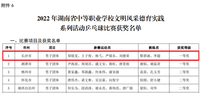 湖南省“文明风采德育实践系列活动乒乓球赛”一等奖