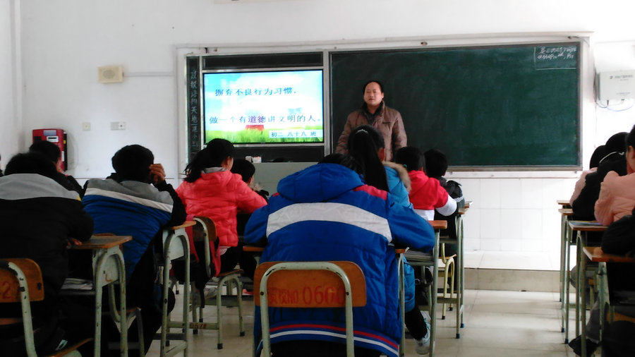2015年3月12日下午第一节课,初二88班在教室举行了“告别陋习,走向文明”主题班会。全班28名同学全部到齐,班会由班主任陈科老师主持,学生科科长乔栋和团委书记张旋出席了本次班会。陈老师用实际事例让同学们认识到自己的不良习惯,带领同学们做了心理测试,并且要求同学们宣誓告别陋习,做文明学生。最后,乔科长做了总结讲话,他说88班同学在本学期有了很大的进步,希望同学们继续努力,更上一层楼。
