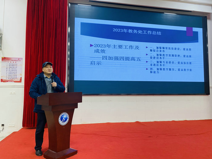 乔栋主任对2023年教务工作做了详实的总结,2023年,教务处重点加强师资队伍建设,加强教学常规管理,加强专业建设,加强服务工作。教师师德修养和专业素养进一步提高;教学质量进一步提升;教学服务组织、协调、保障能力进一步优化。取得了丰硕的成果。