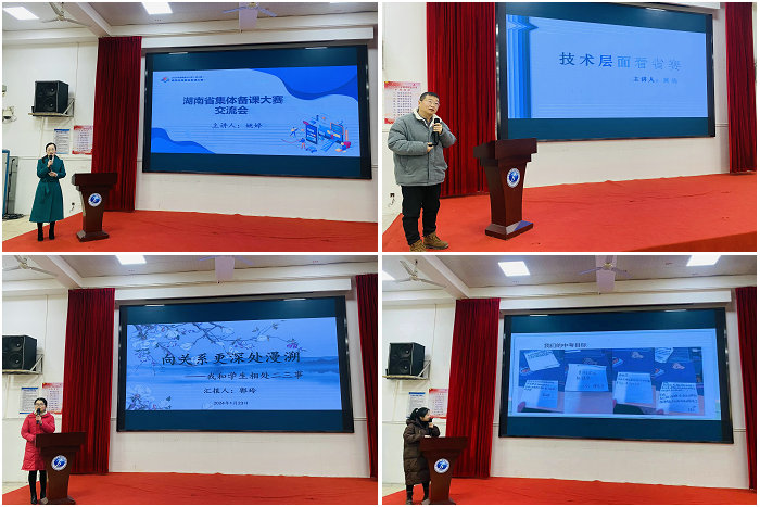 会上,姚婷老师分享集体备课大赛获奖经验,黄晓老师分享集体备课大赛技术支持经验,郭玲老师分享中职优秀班主任工作经验,张芒老师分享初中优秀班主任工作经验,