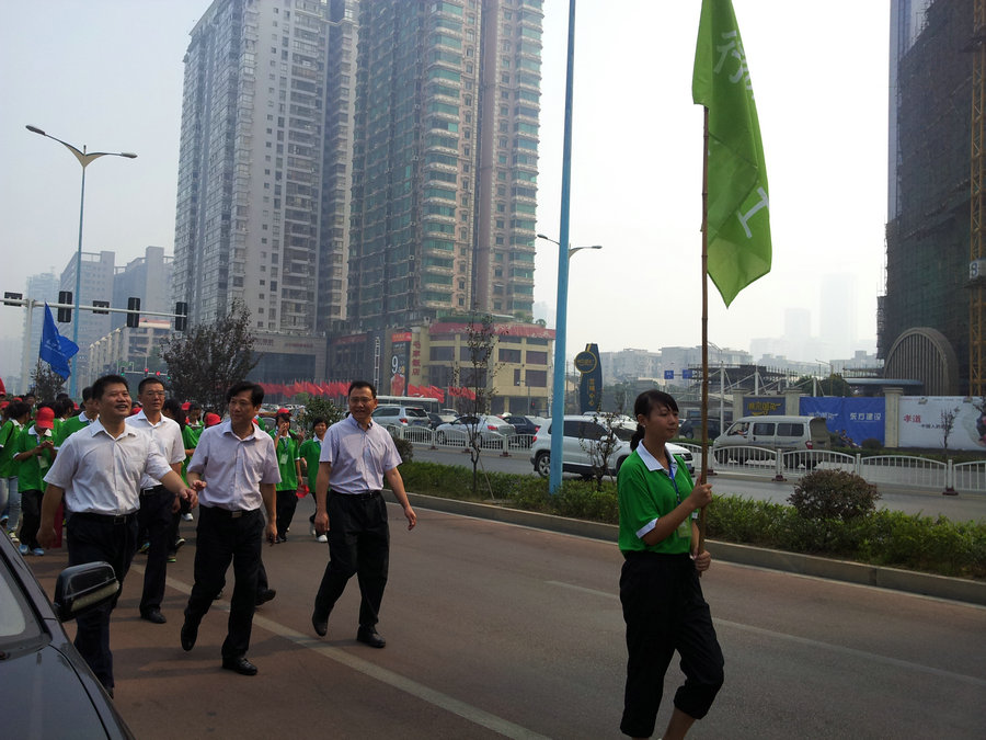 上午9点半,仪式结束后,由我校高13班欧阳艺婕举旗,姚市长等市委领导带头,我校志愿者紧跟其后,带领千名志愿者从长沙湘江大道风帆广场出发,沿湘江大道风光带向南,经橘子洲大桥过江,在沿河西潇湘大道风光带往北到裕湘纱厂前广场,全程步行约5公里,以行走湘江的方式,践行无车日“绿色交通 清新空气”的理念,倡导绿色出行。(撰稿:张旋,照片提供:张旋)