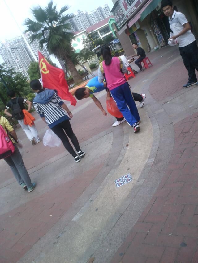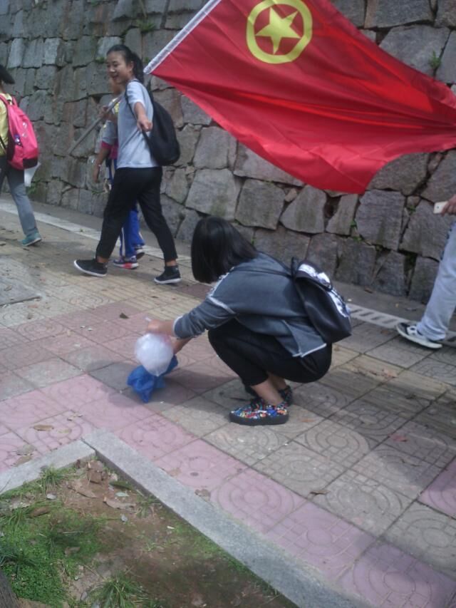 较高的队员举着团旗走在最前,团干和志愿者共分为两队,分别对湘龙街道左右两条街进行清洁。全体成员兴致勃勃,人手一个垃圾袋,路上看到槟榔袋、纸屑等,都用手拾到垃圾袋里。虽然天气很炎热,一个个汗流浃背,但同学们都不抱怨,脸上布满笑容认真工作着,最后,每个人都“收获”满满一大袋垃圾,路边的行人也纷纷对志愿者们竖起大拇指。团干朱贵锋说:“望着我们走过的街道干干净净,这就是我们的劳动成果,也算为创建文明城市出了把力,再苦再累都值得,也希望它能保持下去。”