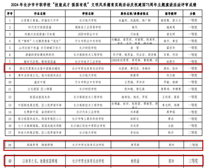 我校郭玲、张玲老师指导的G2301班刘星婷、李晓玲、G2305班黄雨辰《透过巴黎奥运会看中国傲世崛起》主题演讲,荣获一等奖;