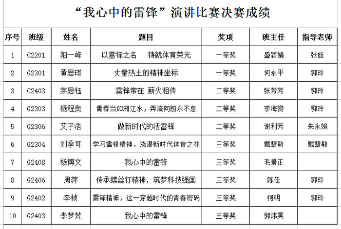 比赛在热烈的掌声中圆满结束。评委们根据选手内容表达与现场表现逐项打分,经过激烈角逐,最终评选出了一等奖2名、二等奖3名和三等奖5名。获奖选手们纷纷表示,将珍惜荣誉,继续努力,将雷锋精神融入到自己的学习和生活中,做好新时代的“雷锋”。