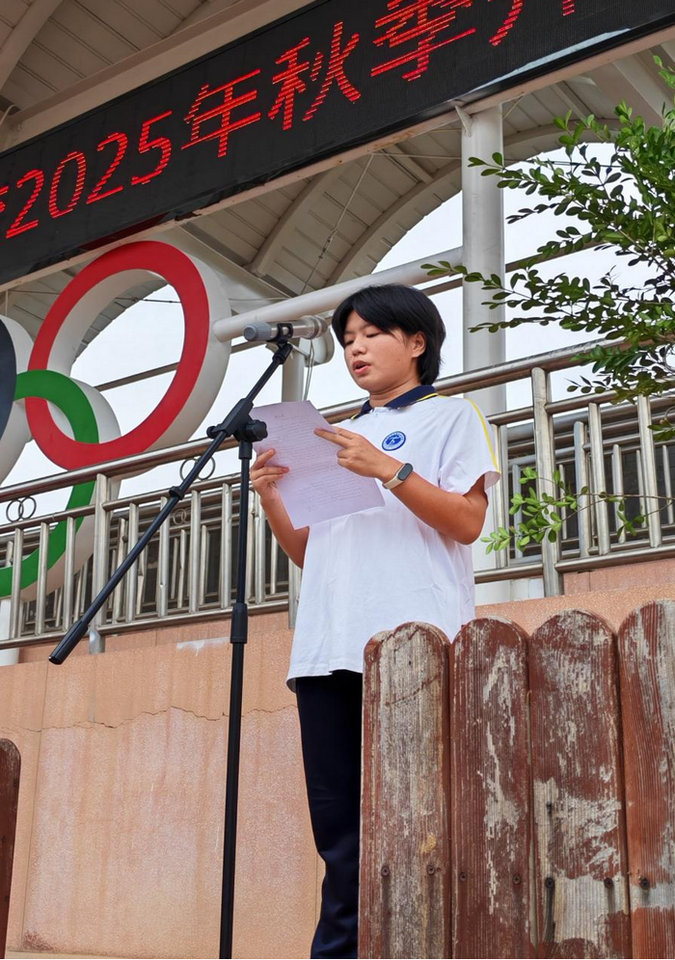 学生代表G2401班张雅薇同学的发言充满朝气与担当。他代表全体学生承诺:“将以汗水浇灌梦想,用行动践行‘更快、更高、更强、更团结’的体育精神,争做德技双修的新时代青年。”青春的誓言中透露出贺校学子敢拼敢赢的信念。
