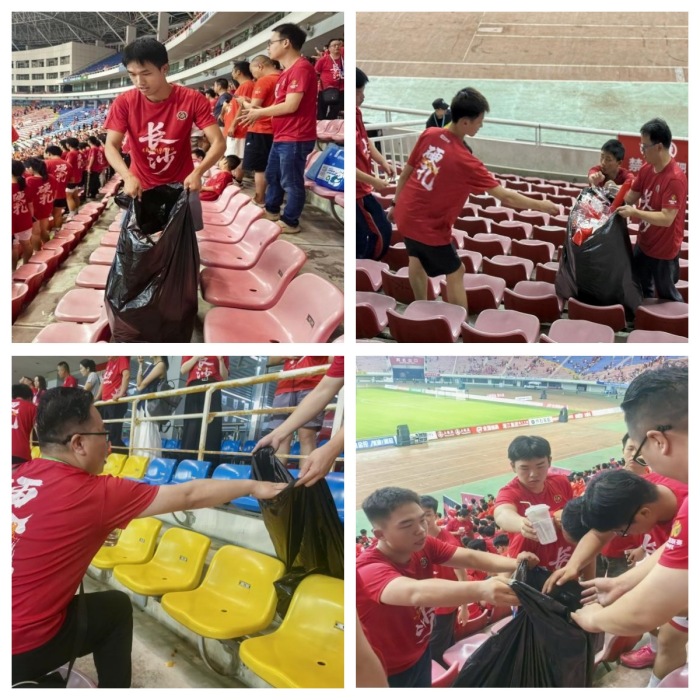 终场哨响,人群渐散,但贺龙体校的学子们却主动留在了最后。学生科、教务科及班主任率先垂范,带领学生俯身于看台座椅间,细致捡拾遗留的纸屑、水杯、槟榔渣,将杂乱的区域恢复整洁。没有指令,没有喧哗,只有默契的配合与忙碌的身影。一位学生边捡边说道:“我们是长沙的‘小主人’,要让全国球迷看到这座城市的干净与温暖。”