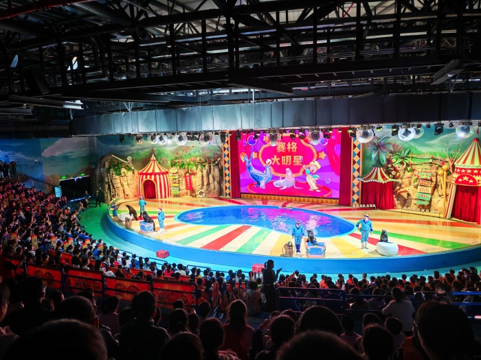 最让同学们欢呼雀跃的,当属海洋剧场与奇幻水域的精彩表演。奥罗拉城堡里,13米巨幕下的白鲸表演让同学们驻足沉醉。随着驯养师的引导,白鲸时而优雅旋转,时而喷水嬉戏,其灵动的身姿与悦耳的叫声赢得阵阵掌声;赛格剧场里,聪明伶俐的海狮顶球、握手,逗得大家开怀大笑;海豚群则腾空跃起,划出优美的弧线,引来阵阵惊叹;人渔秘境里,而唯美浪漫的“人鱼公主”表演,将童话照进现实,在蔚蓝的深海中与鱼群共舞,为同学们上了一堂生动而深刻的海洋生态保护课。