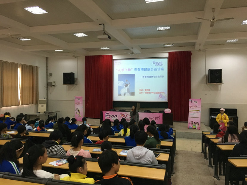 中国青少年公益服务中心的雷老师利用多媒体给初中一年级和二年级的女生们讲解了女生青春期生理变化,生理卫生,青春期心理特点等相关知识,指导学生了解、正视自己的身体变化,教育学生如何保持身心健康,以最佳的精神状态融入学习与生活当中,还讲了怎样防止性骚扰及早恋、早孕的危害等内容,活动现场气氛十分活跃。活动结束后,还有很多女生留下来咨询了一些私人问题才肯离开。