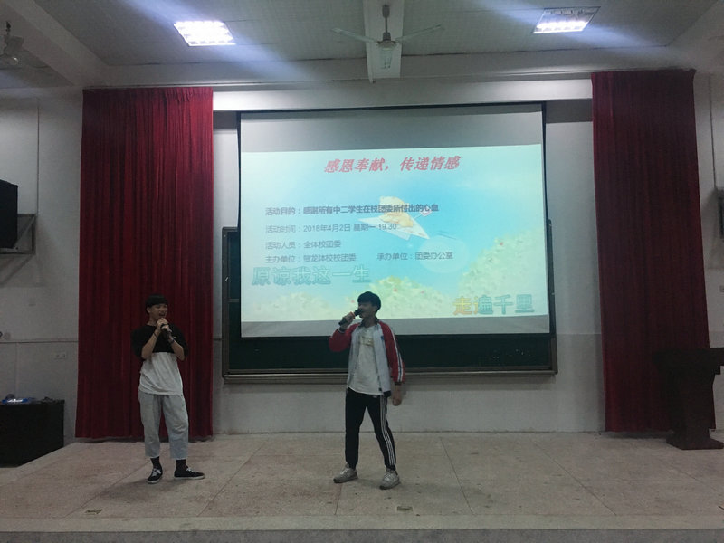新上任的团委副书记54班邓超同学为老团干们献歌