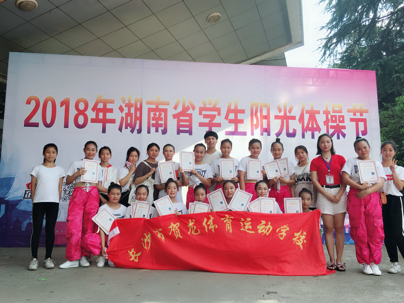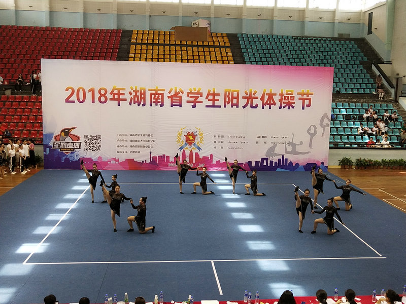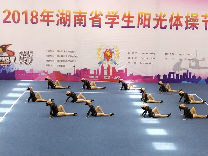 2018月6月23~24日,我校健美操队在周雅琴老师湖南师范大学参加了由两操协会举办的2018年湖南省阳光体操节健美操、啦啦操比赛。周雅琴老师率领本队14人参加了2个组别的比赛。获得少年丙组爵士啦啦操第一名,中学组有氧舞蹈第一名,周雅琴老师被评为优秀教练员。(撰稿人:周雅琴)