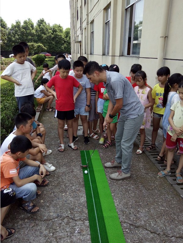 志愿服务队尹力老师首先在室内利用多媒体教学,为孩子全面介绍了高尔夫运动的发展历史、特色魅力以及运动理念。虽然天气十分炎热,但是老师和孩子们的认真专注丝毫没有受到影响。看到尹老师热的汗流浃背,有的学生“善意”举手提醒:“老师,您别紧张。”孩子们的童言童语、天真活泼,给志愿者们留下了深刻印象。