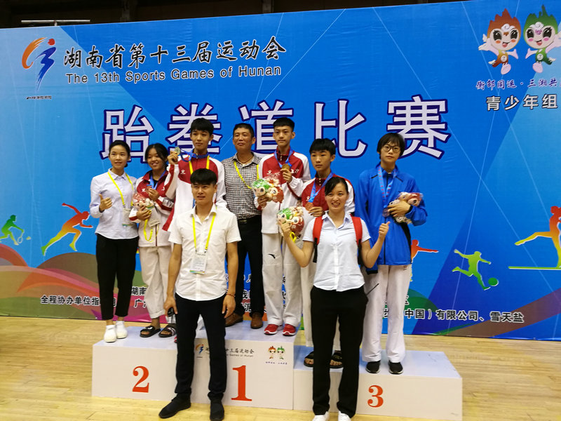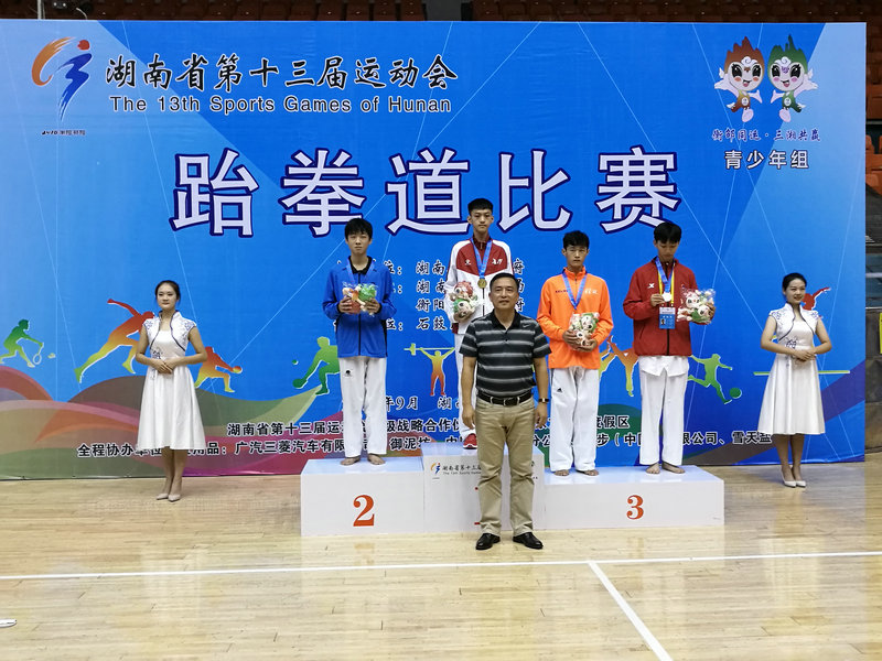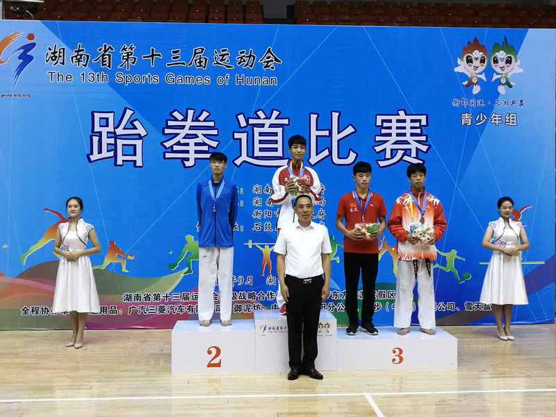 2018年9月3日,省运会跆拳道比赛第三天,杜华学校长亲临赛场督战,我校运动员不负众望,彭鑫以绝对优势夺得了男子乙组-59kg级金牌,男子乙组-51kg级郭一龙敢打敢拼,在曹瑞林教练的指导下,经过努力拼搏,在最后0.75秒绝杀对手为我校代表队夺得第二枚金牌,黄嘉康、周瑶、郭思夺得了铜牌,杜华学校长为我校金牌运动员郭一龙颁奖,望全体运动员再接再厉,在最后一天的比赛上再创辉煌。(撰稿:崔广稳)