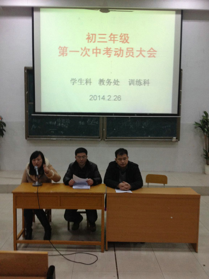 2月26日晚,学生科、教务处、训练科联合召开初三年级第一次中考动员大会。教务处主任罗向阳、副主任黄景全和训练科副科长张晶出席会议,学生科副科长乔栋主持会议。当晚值班的领导和老师文军、潘海兵、冉浩列席会议。