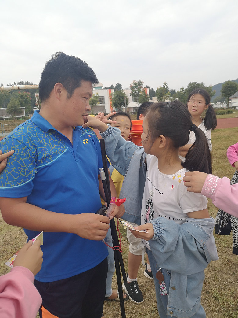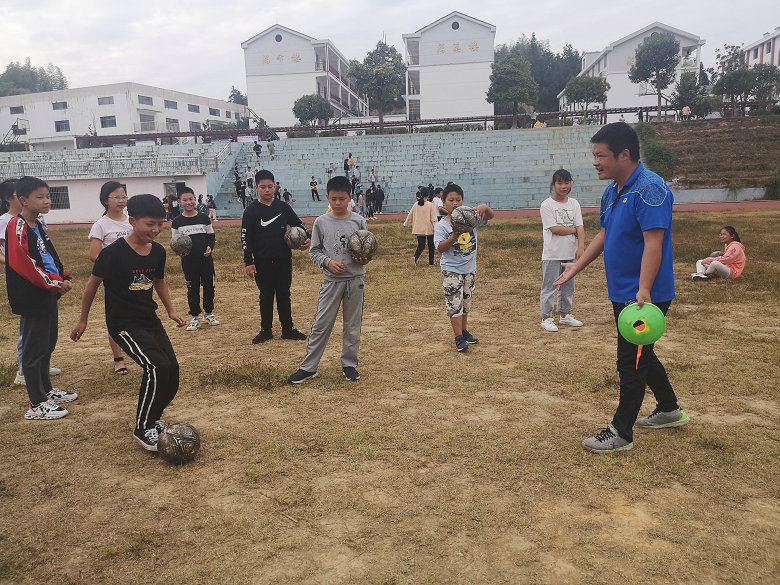 下午,志愿队又马不停蹄地沿着盘山公路赶赴下一个送教服务学校——沩山乡村少年宫。人事科蒋丹老师协助余江老师在该校的原生态足球场上支起反弹板,并将自备的二十个足球带至球场,做好了充分的课前准备。孩子们到齐后,余老师组织了孩子们课前热身,同样教给了孩子们踢球的基本规律,还组织了一场足球赛,课后,他发给孩子们的星星贴纸又被孩子们贴回了他的肩膀上,孩子们热情地呼喊着:“老师,下次什么时候还来?”,“下次来一定要记得找我”,“我们是你的狂热粉丝,别忘了我们”……不舍离去的孩子们拉着余老师拍了一轮又一轮合影,上完两节课的余江老师虽然已是满身疲惫,但是此刻,他说只要让孩子们感受到了体育带给他们的快乐和“更高、更快、更强”的体育精神,一切辛苦都是值得的。