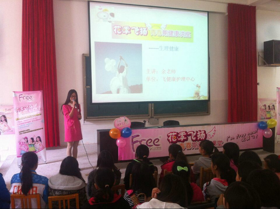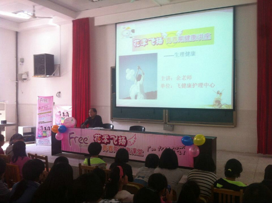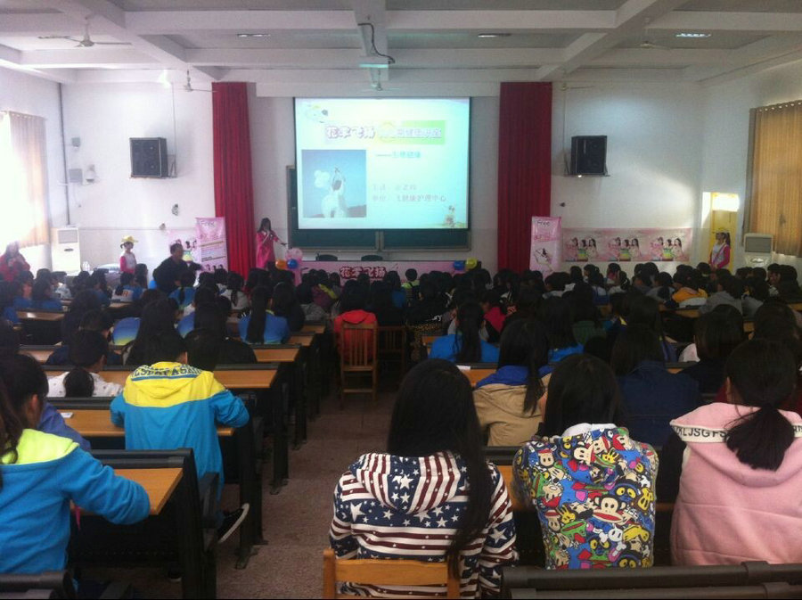 “Free·飞健康护理中心”的余老师给全校300多名女生讲解了女性生理的结构、青春期身体的变化及呵护方法,如何进行自我保护及正确对待早恋等内容,还耐心解答了很多女生的问题,活动现场气氛十分活跃。