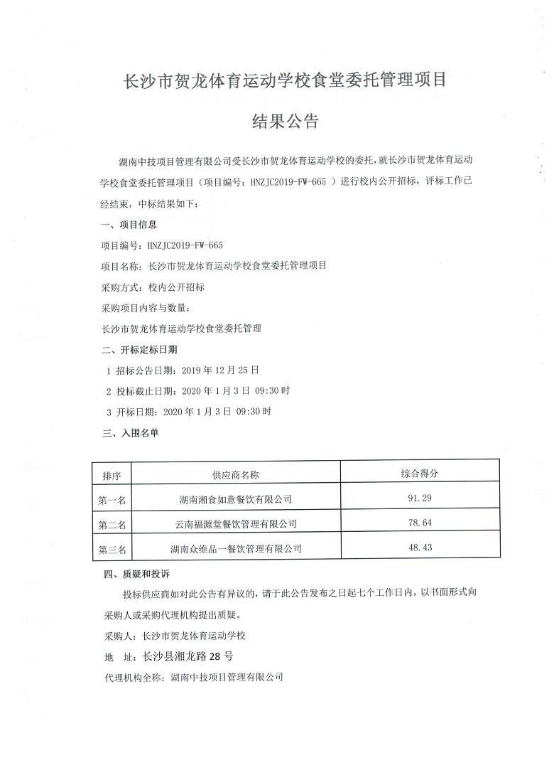 长沙市贺龙体育运动学校食堂委托管理项目结果公告