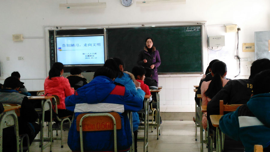 2015年3月12日下午第一节课,初二88班在教室举行了“告别陋习,走向文明”主题班会。全班28名同学全部到齐,班会由班主任陈科老师主持,学生科科长乔栋和团委书记张旋出席了本次班会。陈老师用实际事例让同学们认识到自己的不良习惯,带领同学们做了心理测试,并且要求同学们宣誓告别陋习,做文明学生。最后,乔科长做了总结讲话,他说88班同学在本学期有了很大的进步,希望同学们继续努力,更上一层楼。