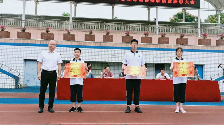 9月4日上午8点, 2020年军训会操表演暨表彰大会在田径场举行。杜华学校长、党委罗文军书记、卢海泉副校长、纪检朱启文书记、刘晚玲副校长及叶斌副校长对同学们的训练成果进行检验。
