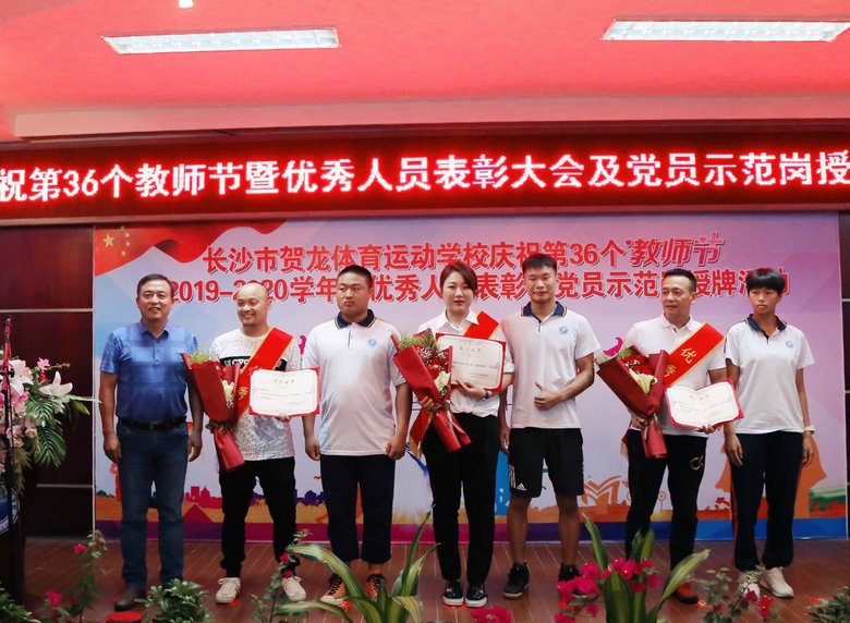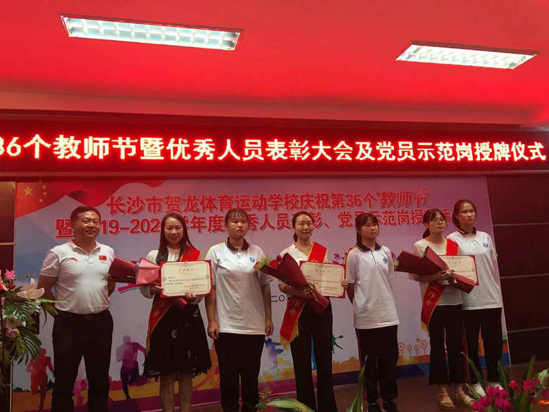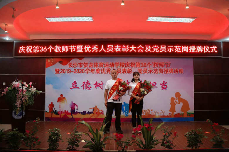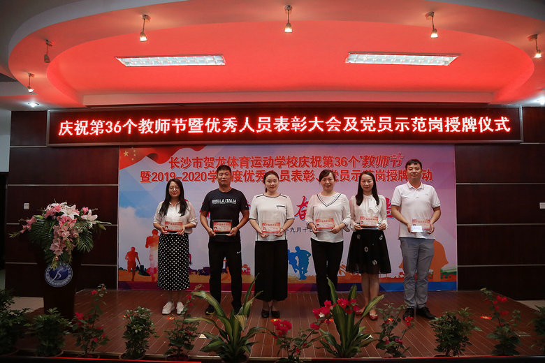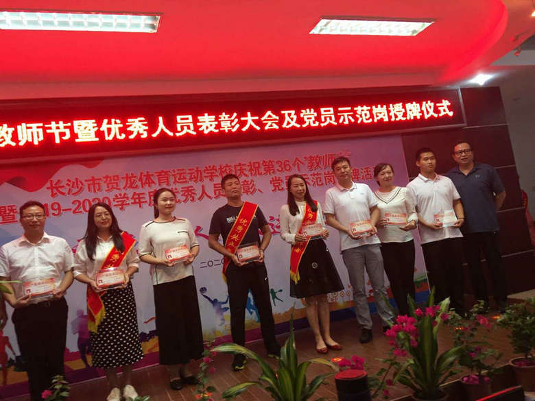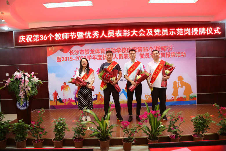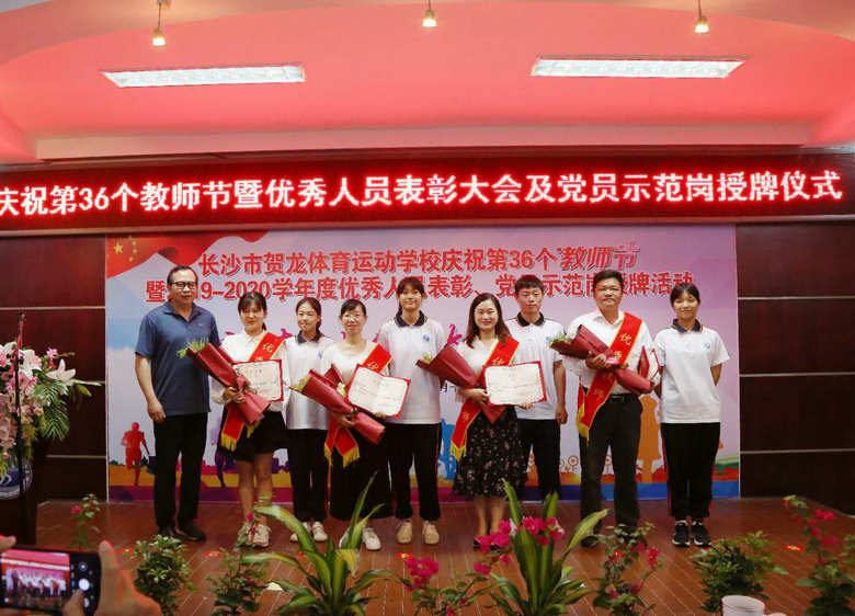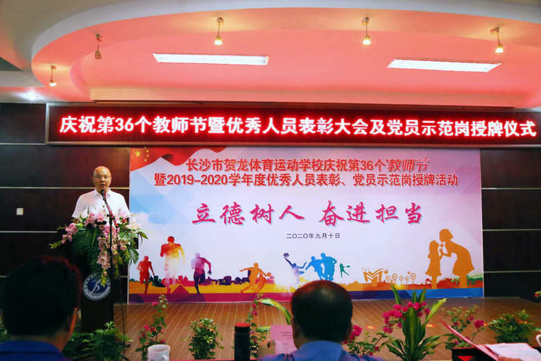 9月10日下午,长沙市贺龙体育运动学校隆重召开2019-2020学年度教师节表彰大会暨党员示范岗授牌仪式。大会表彰了18名优秀教职工,为9名党员示范岗授牌。