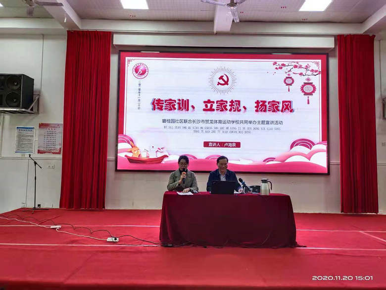为弘扬家庭美德、形成良好风气,做好思想道德建设和家庭文明建设,营造学校职工和谐家庭氛围,11月20日下午,长沙市贺龙体育运动学校联合星沙街道碧桂园社区共同举办“传家训、立家规、扬家风”主题讲座,我校卢海泉副校长做主题报告,学校党员干部、教职工以及碧桂园社区代表,共计八十余人参加活动。