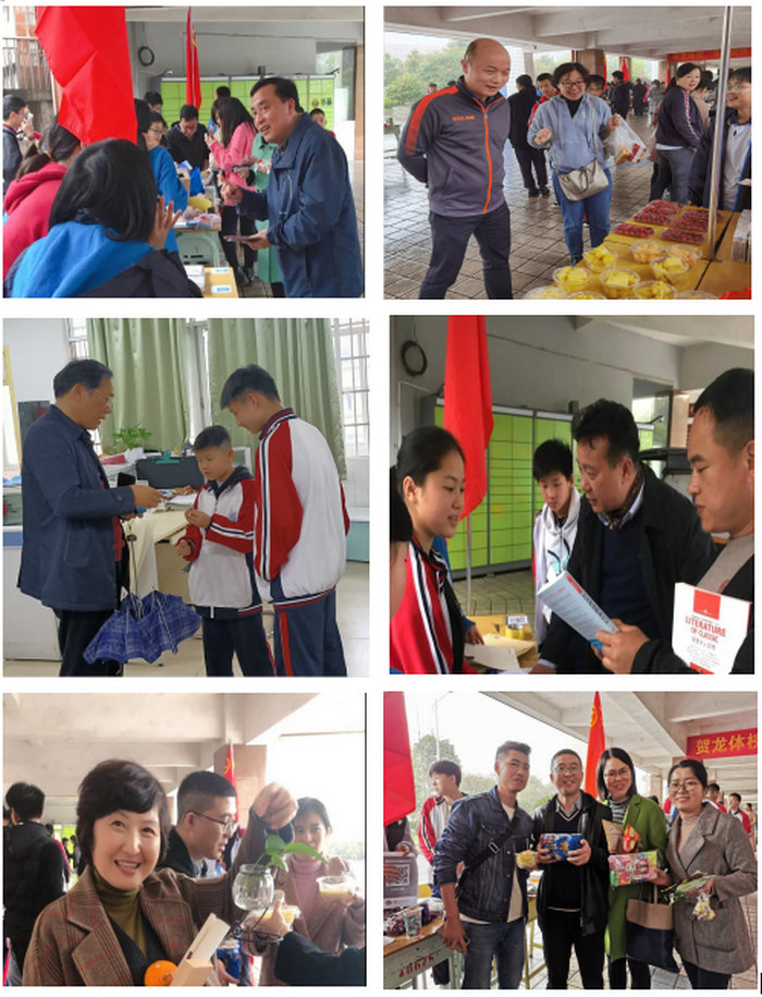 学校架空层里人潮涌动,以班级为单位的21个摊位上义卖物品琳琅满目,G2006班班主任带着学生亲自熬制的杨枝甘露;G2001班有周若星辰的家长亲手制作的卤鸡爪;G1906班有热乎着的“coco”奶茶;C1901班有新鲜的水果拼盘…..各班制作的义卖海报也吸引眼球,成为一道美丽的风景线。“走过路过不要错过”,“瞧一瞧看一看咯!”各班的义卖员们卖力的呼喊着;C2002班的小摊主还敲起了锣鼓招揽生意;还有流动“商家”带着自家商品到处寻找买家,他们的甜言蜜语和自卖自夸的方式让人难以招架。