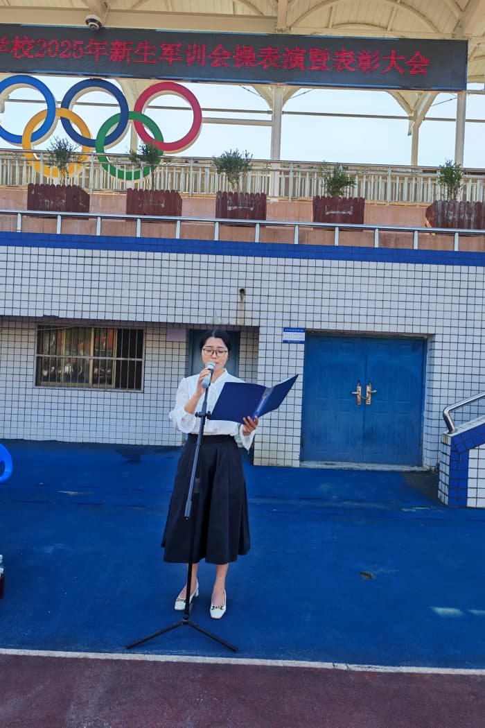 教师代表G2506班班主任郭玲老师结合校训精神,充分肯定了同学们在军训中的精彩表现,她深情寄语全体新生:“要把‘厚德’显现在待人处物中,以宽容和善良的心态对待他人;把‘强体’融在日常锻炼里,养成坚持运动的好习惯;把‘笃学’用在每节课上,专注学习、积极思考;让‘精技’落实在每一次实践中,不断提升自己的专业技能。”郭老师的话语如春风化雨,滋润着每一位新生的心田。”