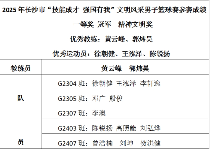 我校男子篮球队在比赛中展现了绝对的统治力,他们一路过关斩将,最终勇夺冠军,荣获一等奖。尤为可贵的是,球队在赛场上所展现出的团结协作、尊重对手的体育精神,赢得了组委会和对手的一致好评,成功将含金量极高的 “精神文明奖” 一并收入囊中,实现了成绩与形象的双丰收。队员徐朝健、王泓泽、陈锐扬凭借其突出的个人技术和赛场表现,荣获“优秀运动员”称号。黄云峰、郭炜昊两位教练被评为“优秀教练”,他们的辛勤指导是球队成功的坚实保障。