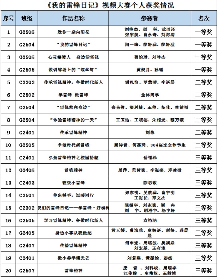 自3月以来,学生科、校团委组织开展了以“我的雷锋日记”为主题的视频制作比赛。全校各班积极参与,用镜头记录善举,用影像传递温暖,生动展现了新时代青少年对雷锋精神的理解与行动。 [详细]