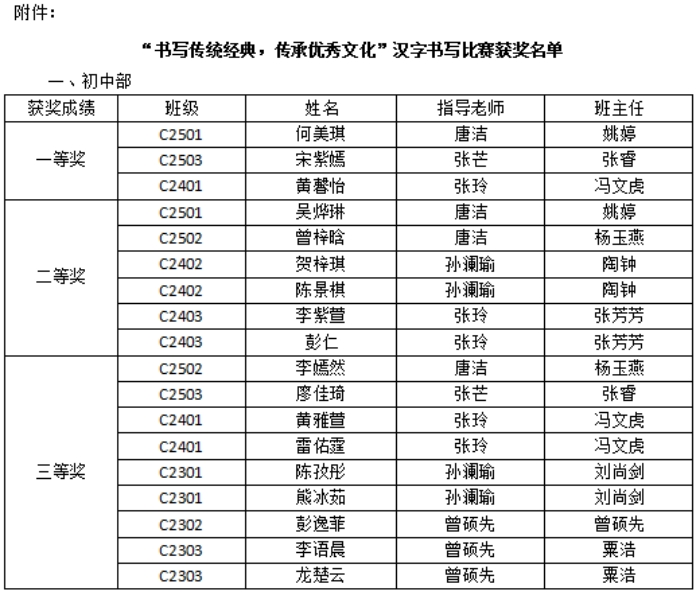 此次汉字书写比赛不仅为学生提供了展示书写才华的平台,更营造了重视汉字书写、传承传统文化的校园氛围。学校语文教研组表示,将以此次比赛为契机,持续推动学生语文素养的提升,让汉字之美在校园中代代相传。获奖同学纷纷表示将珍惜荣誉、再接再厉,全体学生也将以获奖同学为榜样,勤于练习,在笔墨间感受中华优秀传统文化的魅力。(撰稿:郭玲)